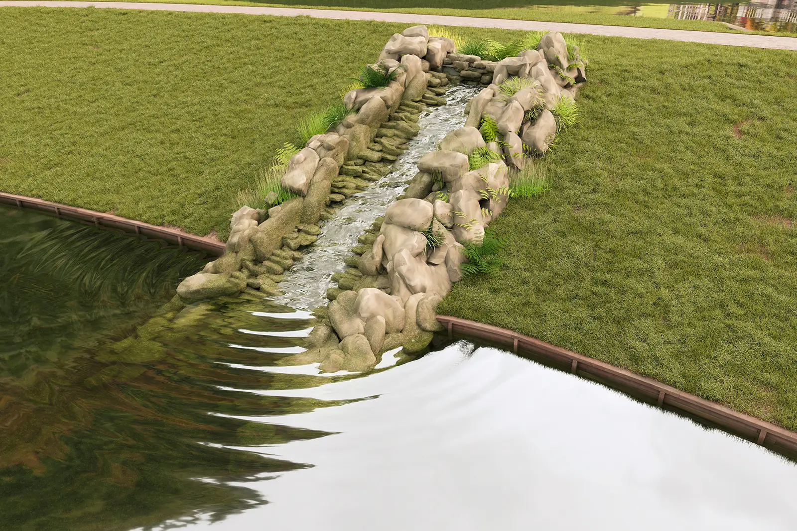 We faced challenges in creating realistic representations of the landscape. This included generating various options for the inlets and outlets and exploring different stone and grout designs to assess how they would blend harmoniously with the historic context.
